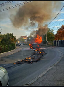 Tragovi požara vidljivi su i na kolovozu, a saobraćaj je potpuno obustavljen.