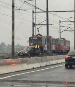 Na Mostu na Adi danas se dogodila nesvakidašnja situacija kada je jedan putnički automobil, iz za sada neutvrđenih razloga, sleteo direktno na tramvajske šine.